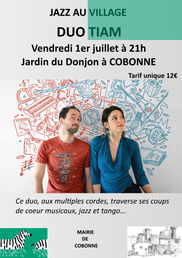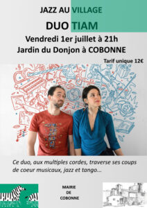 Duo Tiam, aux multiples cordes, traverse ses coups de cœurs musicaux jazz et tango. Rendez-vous est donné au Jardin du Donjon de Cobonne pour ce vendredi 1er juillet à 21h00. Entrée 12 euros.