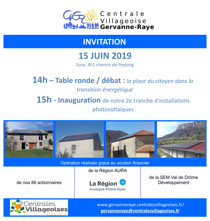 Vous trouverez ci-dessous l’invitation de Mme Fourquin pour inaugurer la 2ième tranche des travaux de la centrale photovoltaïque villageoise Gervanne Raye.