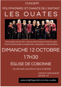 Les Ouates organiseront un concert à l’église de Cobonne ce dimanche à 17h30. Venez nombreux!