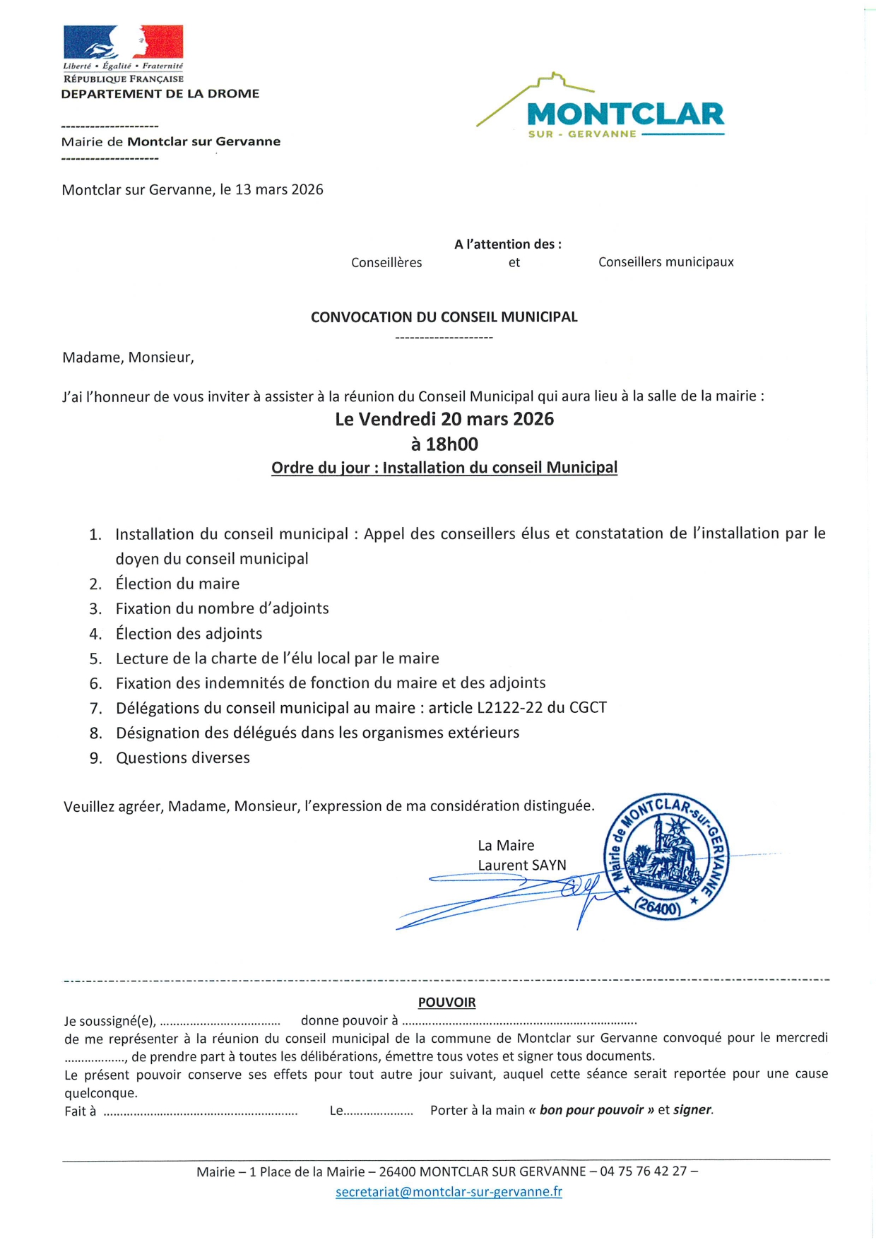 Suite aux élections municipales qui s’est tenue le 15 mars 2026, le nouveau conseil municipal se réunira le vendredi 20 mars 2026 à 18h00 en mairie : ordre du jour